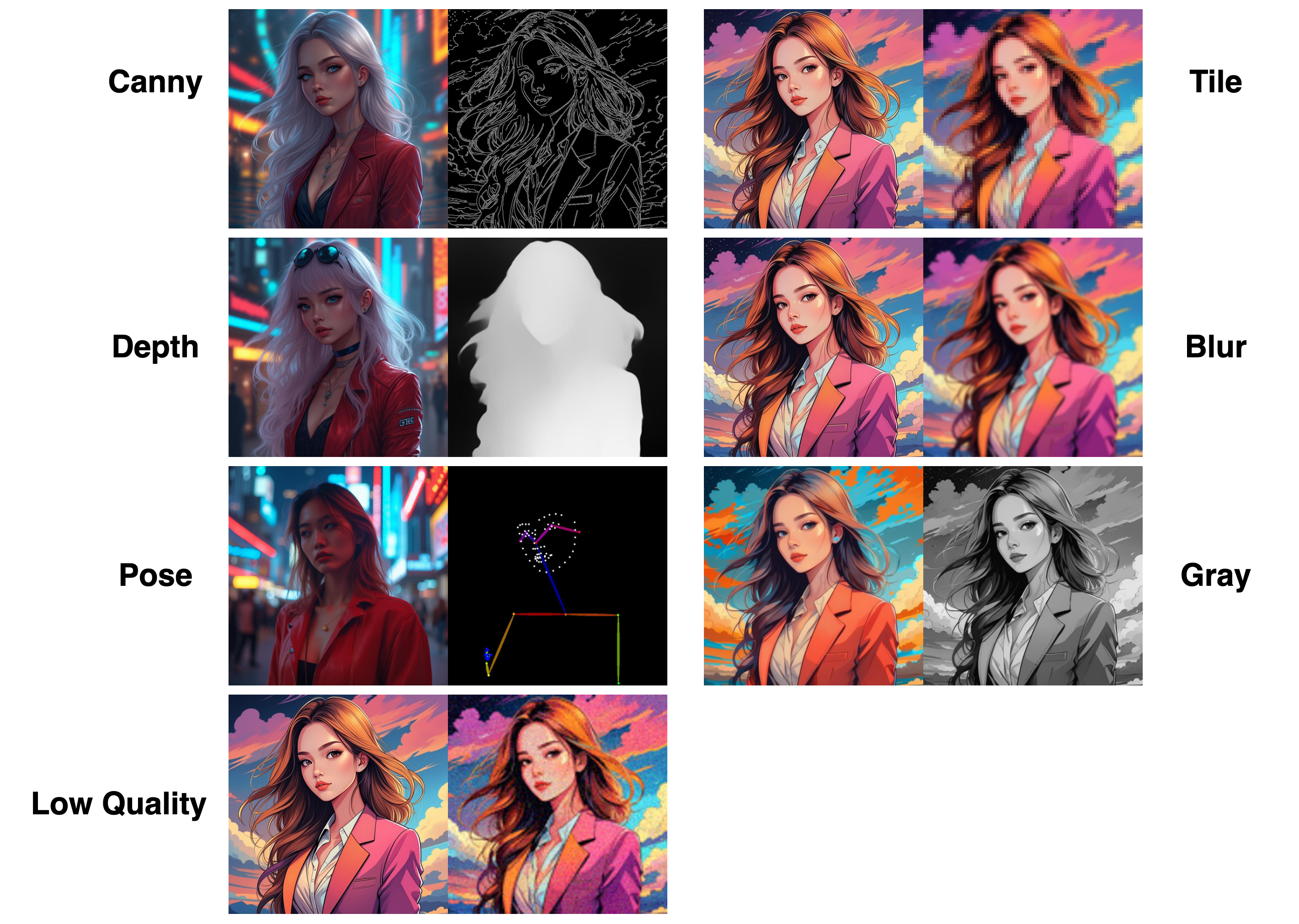 --- license: other license_name: flux-1-dev-non-commercial-license license_link: https://huggingface.co/black-forest-labs/FLUX.1-dev/blob/main/LICENSE.md tags: - Text-to-Image - ControlNet - Diffusers - Stable Diffusion base_model: black-forest-labs/FLUX.1-dev --- # FLUX.1-dev-Controlnet-Union ## Release ## Checkpoint The training of union controlnet requires a significant amount of computational power. The current release is the first beta version checkpoint that maybe not been fully trained. The fully trainedbeta version is in the training process. We have conducted ablation studies that have demonstrated the validity of the code. The open-source release of the first beta version is solely to facilitate the rapid growth of the open-source community and the Flux ecosystem; it is common to encounter bad cases (please accept my apologies). It is worth noting that we have found that even a fully trained Union model may not perform as well as specialized models, such as pose control. However, as training progresses, the performance of the Union model will continue to approach that of specialized models. ## Control Mode | Control Mode | Description | Current Model Validity | |:------------:|:-----------:|:-----------:| |0|canny|🟢high| |1|tile|🟢high| |2|depth|🟢high| |3|blur|🟢high| |4|pose|🟢high| |5|gray|🔴low| |6|lq|🟢high| # Inference ```python import torch from diffusers.utils import load_image from diffusers import FluxControlNetPipeline, FluxControlNetModel base_model = 'black-forest-labs/FLUX.1-dev' controlnet_model = 'InstantX/FLUX.1-dev-Controlnet-Union' controlnet = FluxControlNetModel.from_pretrained(controlnet_model, torch_dtype=torch.bfloat16) pipe = FluxControlNetPipeline.from_pretrained(base_model, controlnet=controlnet, torch_dtype=torch.bfloat16) pipe.to("cuda") control_image_canny = load_image("https://huggingface.co/InstantX/FLUX.1-dev-Controlnet-Union-alpha/resolve/main/images/canny.jpg") controlnet_conditioning_scale = 0.5 control_mode = 0 width, height = control_image.size prompt = 'A bohemian-style female travel blogger with sun-kissed skin and messy beach waves.' image = pipe( prompt, control_image=control_image, control_mode=control_mode, width=width, height=height, controlnet_conditioning_scale=controlnet_conditioning_scale, num_inference_steps=24, guidance_scale=3.5, ).images[0] image.save("image.jpg") ``` # Multi-Controls Inference ```python import torch from diffusers.utils import load_image from diffusers import FluxControlNetPipeline, FluxControlNetModel, FluxMultiControlNetModel base_model = 'black-forest-labs/FLUX.1-dev' controlnet_model_union = 'InstantX/FLUX.1-dev-Controlnet-Union' controlnet_union = FluxControlNetModel.from_pretrained(controlnet_model_union, torch_dtype=torch.bfloat16) controlnet = FluxMultiControlNetModel([controlnet_union]) # we always recommend loading via FluxMultiControlNetModel pipe = FluxControlNetPipeline.from_pretrained(base_model, controlnet=controlnet, torch_dtype=torch.bfloat16) pipe.to("cuda") prompt = 'A bohemian-style female travel blogger with sun-kissed skin and messy beach waves.' control_image_depth = load_image("https://huggingface.co/InstantX/FLUX.1-dev-Controlnet-Union/resolve/main/images/depth.jpg") control_mode_depth = 2 control_image_canny = load_image("https://huggingface.co/InstantX/FLUX.1-dev-Controlnet-Union/resolve/main/images/canny.jpg") control_mode_canny = 0 width, height = control_image.size image = pipe( prompt, control_image=[control_image_depth, control_image_canny], control_mode=[control_mode_depth, control_mode_canny], width=width, height=height, controlnet_conditioning_scale=[0.2, 0.4], num_inference_steps=24, guidance_scale=3.5, generator=torch.manual_seed(42), ).images[0] ``` # Resources - [InstantX/FLUX.1-dev-Controlnet-Canny](https://huggingface.co/InstantX/FLUX.1-dev-Controlnet-Canny) - [InstantX/FLUX.1-dev-Controlnet-Union](https://huggingface.co/InstantX/FLUX.1-dev-Controlnet-Union) - [Shakker-Labs/FLUX.1-dev-ControlNet-Depth](https://huggingface.co/Shakker-Labs/FLUX.1-dev-ControlNet-Depth) - [Shakker-Labs/FLUX.1-dev-ControlNet-Union-Pro](https://huggingface.co/Shakker-Labs/FLUX.1-dev-ControlNet-Union-Pro) # Acknowledgements Thanks [zzzzzero](https://github.com/zzzzzero) for help us pointing out some bugs in the training.