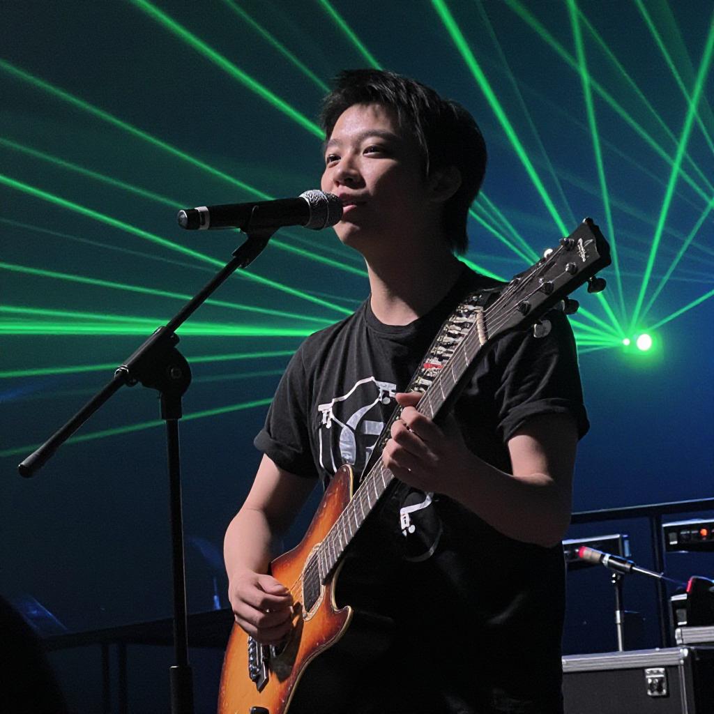 - Jacob playing the guitar, on stage, singing a song, laser lights, punk rocker