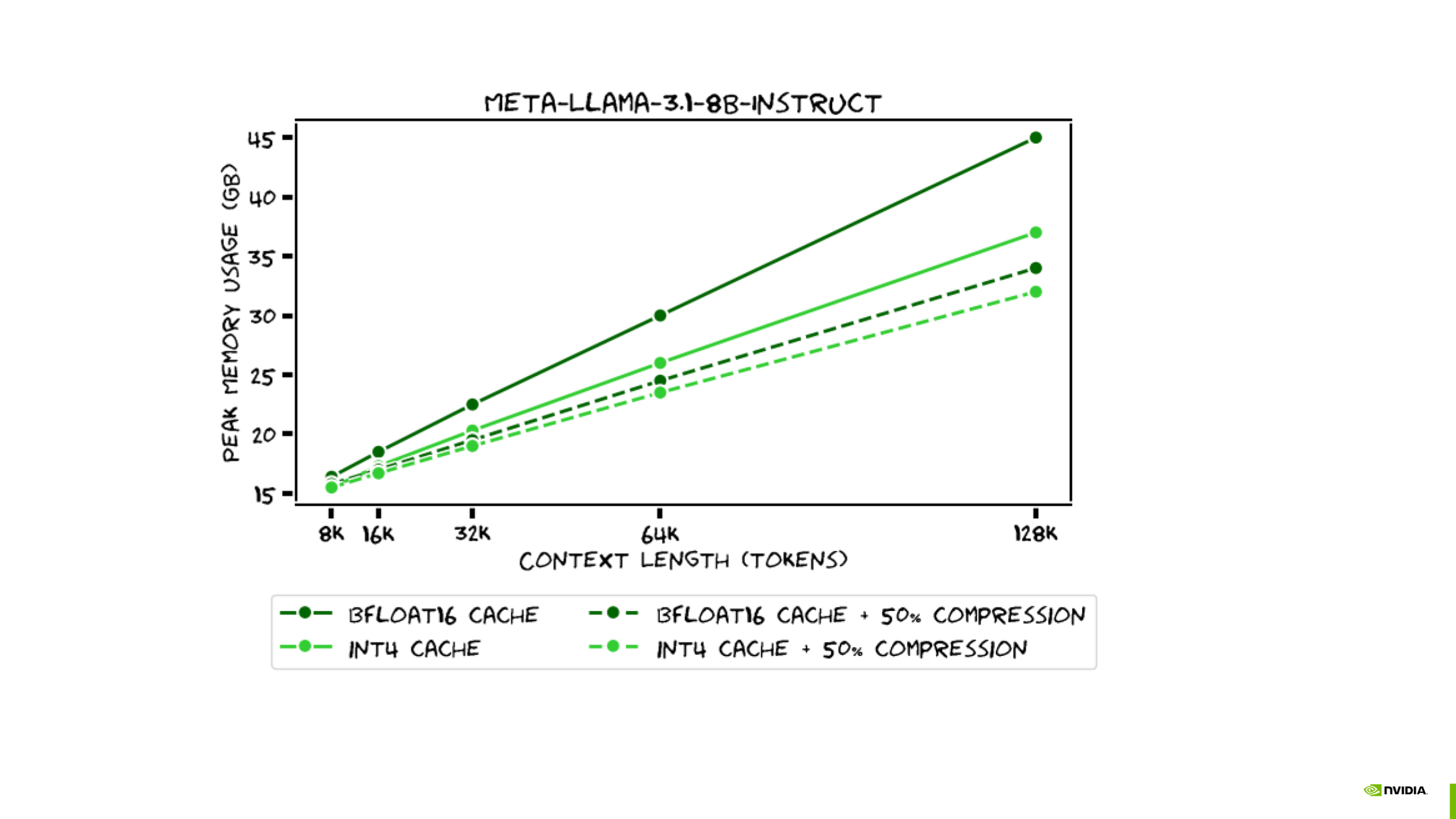 The plot below demonstrates the GPU memory savings achieved with KVPress compression as prompt lengths increase. For shorter prompts, most of the memory is allocated to model weights—approximately 15GB for Llama 3.1 8B in bfloat16. However, as prompt lengths grow, the KV cache becomes a major contributor to memory consumption. For 128k context length, applying KVPress with a 50% compression ratio reduces peak memory usage from 45GB to 37GB. This smaller KV cache also improves decoding speed, from 11 tokens per second to 17 tokens per second on an A100 GPU (source). .