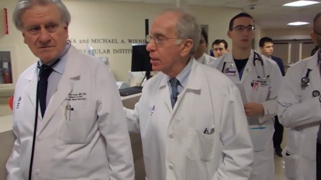 “Dr. Fuster and I make rounds the old fashioned way. The first thing that we do is go to the patient and hold his hand. With that touch you establish rapport instantly. We were trained to go to the bedside and talk to the patients, and take the perfect history, do the perfect physical, from which one ought to be able to make a diagnosis or come close to a diagnosis, maybe 90% of the time,” says Dr. Sklaroff.