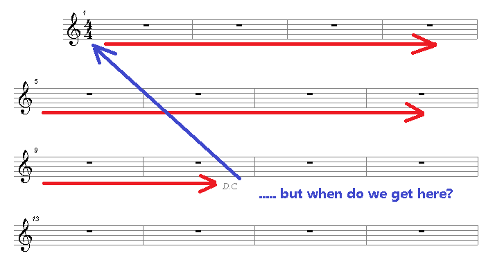 We usually start at the top of the 1st page and end at the bottom of the last page, but sometimes a composer will want us to change this sequence.  As before, this is merely to save on rewriting long sections of notes.  Composers use a few symbols to communicate their instructions to us.  (In the diagrams below, the red arrows show how we would start reading the music, and the blue arrows show how this will change as a result of the instructions.)
