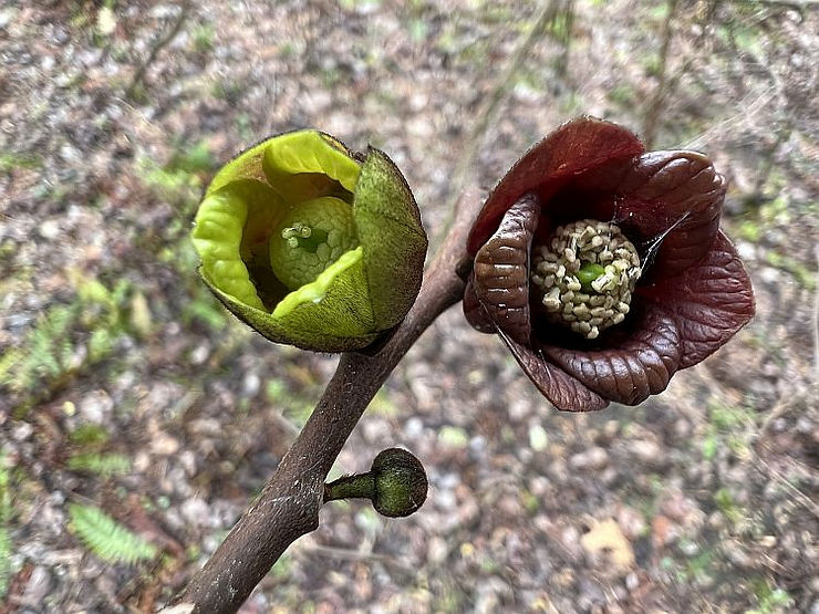 In early to mid-April, just before the new leaves emerge, Pawpaws begin to bloom with a most distinctive flower. The small, unusual flowers are intriguing, only about 1-1/2” wide, hanging from the bare branches like dark maroon bells. Each flower is beautiful when inspected closely, with three broadly rounded outer petals that curve back, revealing another ring of three smaller petals that surround the stamens and pistils in the center of the flower. The petals themselves have a heavy texture with impressed veins and their rich maroon-brown color that glows when backlit by the sun. If you sniff the flowers closely, you may notice the fetid odor of carrion that has evolved to lure their pollinators. Pawpaws belong to an ancient family of flowering plants that evolved about 85 million years ago and the dark red flowers and odor attract the carrion flies and scavenger beetles that pollinate them. Interestingly, flowers of trees in the same “patch” are genetically identical and often are not self-fertile, meaning a pollinator must carry the pollen from a flower in one colony to flowers in another colony to reliably produce fruit. This and the fact that their pollinators are not in great abundance, means that there is sometimes low fruit set in some colonies.