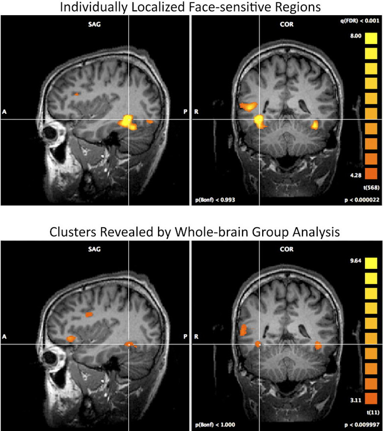 This is a brain scan of someone being shown images of faces. The bright spots are oxygenated blood rushing to the fusiform gyrus, a sign that it is being strongly activated.