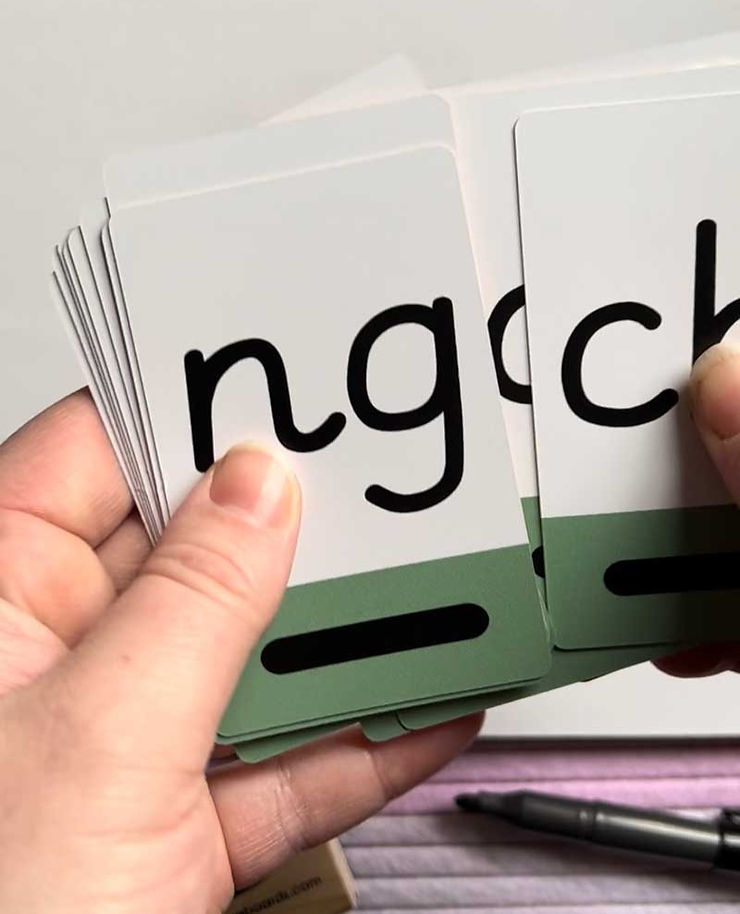 Select two cards and place them face up. Ask your child to guess which sound will be chosen and to write the sound on their dry wipe board.