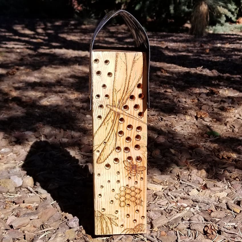 Functional wood burned and hand drilled bee house.