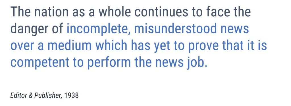In 1938 Editor & Publisher, the leading trade publication for the print media industry, offered this ominous opinion in response to the War of the Worlds broadcast incident, lending its voice (for obvious reasons) to the anti-radio campaign.