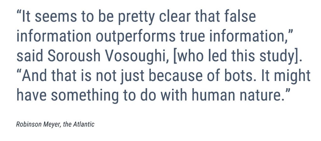 A group of data scientists at MIT recently published in Science magazine the findings of the largest-ever study of news circulated via social media. The study examined every major English-language news story in the history of Twitter. The data set comprised 126,000 verified true or false stories, tweeted around 4.5 million times by ~3 million users over the course of a decade. According to the abstract, the study “classified news as true or false using information from six independent fact-checking organizations that exhibited 95 to 98% agreement on the classifications.” The complexity and rigor of the study is summarized well in “The Grim Conclusions of the Largest-Ever Study of Fake News,” an article from the Atlantic’s Robinson Meyer.