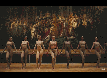 One of the key artworks they use is The Consecration of the Emperor Napoleon and the Coronation of Empress Joséphine, by Jacques-Louis David which is a huge painting representing the moment Emperor Napoléon I crowns his wife Joséphine de Beauharnais. Dancing along with eight other dancers, Queen B places herself just under the Empress.