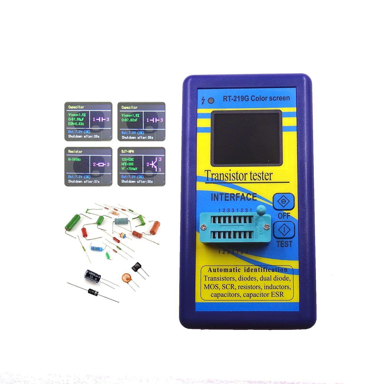 1:Automatic detection of NPN and PNP transistors, n-channel and p-channel MOSFET, diode (including double diode), thyristor, transistor, resistor and capacitor and other components 2: Automatic test the pin of a component, and display on the LCD 3:Can detect the transistor, MOSFET protection diode amplification coefficient and the base to determine the emitter transistor forward biased voltage 4: Measure the gate and gate capacitance of the MOSFET threshold voltage Automatic identification devices. Automatically determine the pin. Automatic measurement parameters.