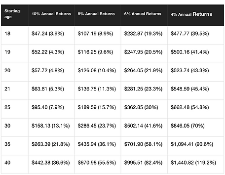 The federally mandated minimum wage is $7.25/hr. The math in the chart below says that if a person who is 18 years old and earning the minimum wage started saving 3.9% of her monthly wages ($47 dollars), assuming she worked 40 hours a week and did so until retirement at age 70, she would have accumulated $1 million, assuming the money was invested and earned the long run, historical average of 10%. If you know an 18-year old, get her started. Better yet, send her to me and let me get her started and stay with her throughout her journey since there will be lots of forks in the road and decision points to navigate and consider. And by all means, you come too. Your age range is approximated somewhere in the chart too. By now things have probably gotten a little more complicated financially. But we can still figure something out so that you can be in a place you’d like to be in when you retire.