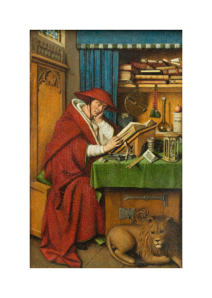 Delicate and intricate in its execution and rich in its symbolism, this small panel painting attributed to the workshop of Jan van Eyck depicts Saint Jerome, the fourth-century translator of the Bible, reading in his study. According to legend, Jerome extracted a thorn from a lion's paw. The books and other objects seen here relate to the saint's intellectual pursuits and take on symbolic meanings. The hourglass is traditionally equated with the passage of time and human mortality. The glass bottle is undisturbed by the light passing through it just as the virginity of Mary was undisturbed by the Holy Spirit when she conceived Jesus. The jar labeled tyriaca (an antidote for snakebite) surmounted by a pomegranate (a symbol of the resurrection) refers to Christ as the savior of the world. Based on the inscription on the folded letter on the table, it has been suggested that the figure of Saint Jerome is a disguised portrait of Cardinal Niccolò Albergati.