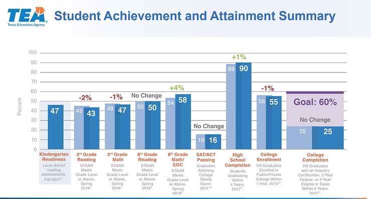 During his testimony at the January 30 Committee on Public Education hearing, Commissioner Mike Morath reviewed a presentation in which he referenced a "Student Achievement and Attainment Summary." (You can read the full presentation here.)