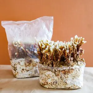 - Provide suitable microclimate: Certain mushrooms like Antler Reishi (shown in the picture below), King Oyster & Enoki need a specific microclimate (high in C02 for example) to grow a certain way, the plastic helps in maintaining certain cultivation parameters.