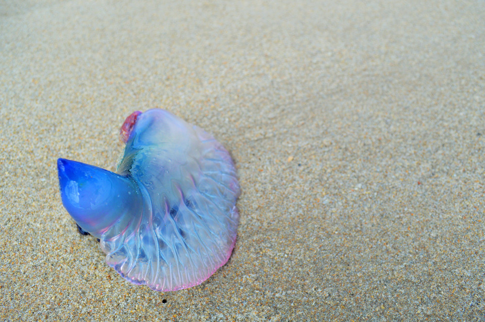 Found on the beach in West Palm Beach, FL. A Portuguese Man-O-War; similar to a jellyfish. It is a siphonophore, an organism composed of smaller organisms working together. It is composed of four separate polyps, with tentacles that measure on average thirty feet. Its tentacles are covered in venom-filled nematocysts, used to paralyze and kill fish and other small creatures. For humans it is rarely deadly, but delivers an excruciatingly painful and powerful sting.