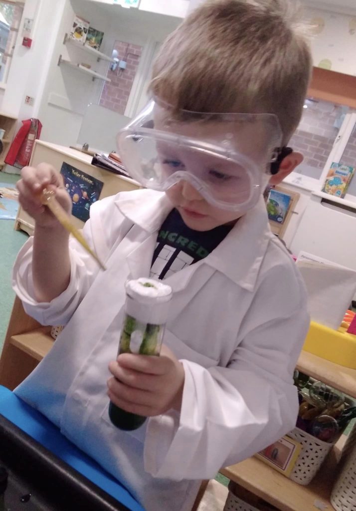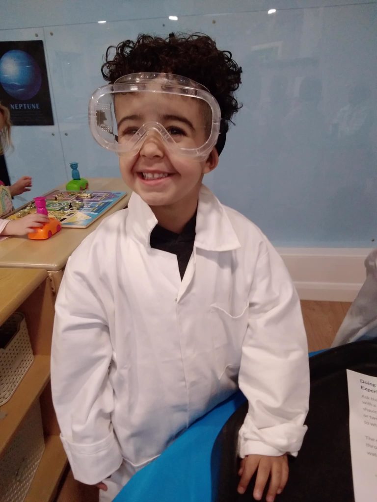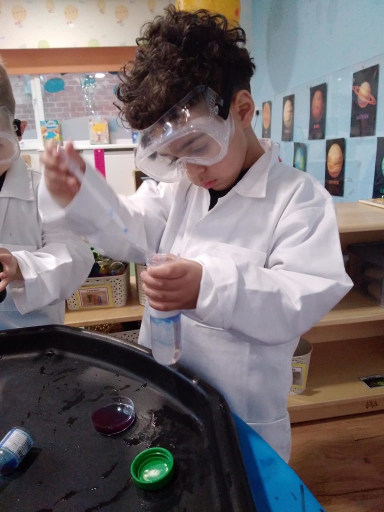 The children really enjoyed getting suited up with their lab coats and goggles to carry out their experiment, one that we revisited because it linked with our weather. Using shaving foam and water the children made their own rain!