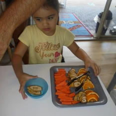 As we continue to develop the children's agency we will try to provide children with the opportunity to extend on their self help skills. During morning tea the children were encouraged to to make their own food selection choices and serve them selves using tongs. The use of the tongs proved challenging for a few of the children, so the educators offered a little assistance when required.