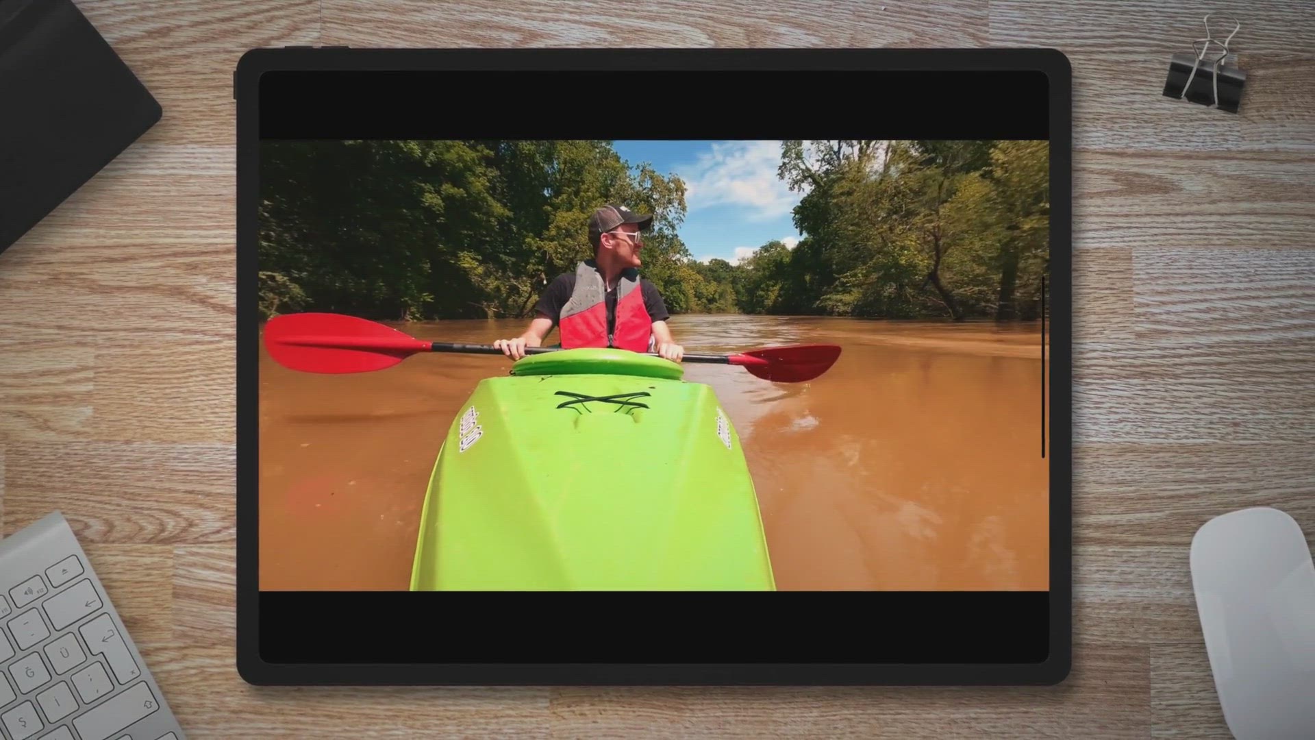 PADDLE — A shaft with two flat blades used to propel a kayak through the water. Paddles can be made of wood, alumnium, or plastic.