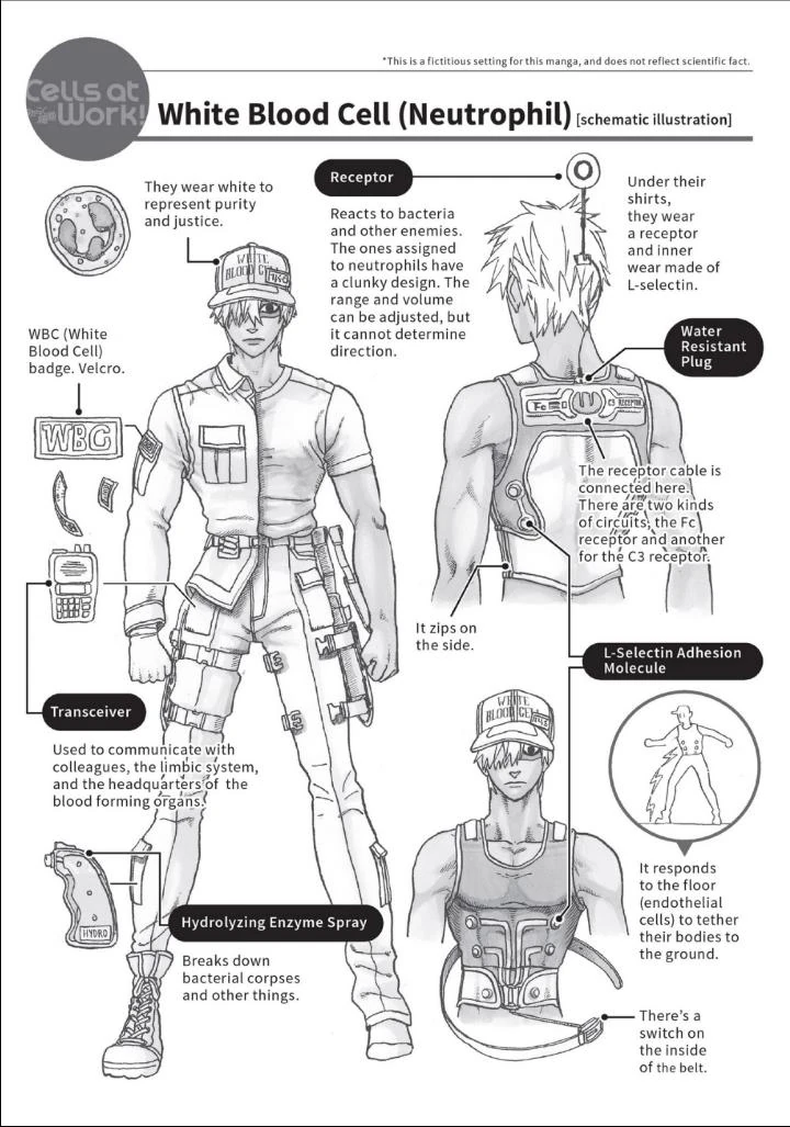 All Neutrophils wear the same uniform, which is similar to the modern day military uniform except it only consists of the color white. The jacket has two pockets on the front and two with initials on the shoulder section; the pants have multiple pockets as well. They wear belts that overlay on the jacket and are attached to the knife sheaths strapped on their thighs. They also wear normal laced boots, gloves and a cap printed with '白血球' (Japanese word for 'White Blood Cell') with a plate consisting their number written on it. A receptor that functions like a radar is attached to a vest with a thin water resistant cable under their inner shirt. This receptor is connected and powered by two circuits: the Fc receptor and the C3 receptor. Their vest is made of L-selectin and includes L-selectin Adhesion Molecules that can tether their bodies to the ground. It can be controlled through a switch inside their belt.