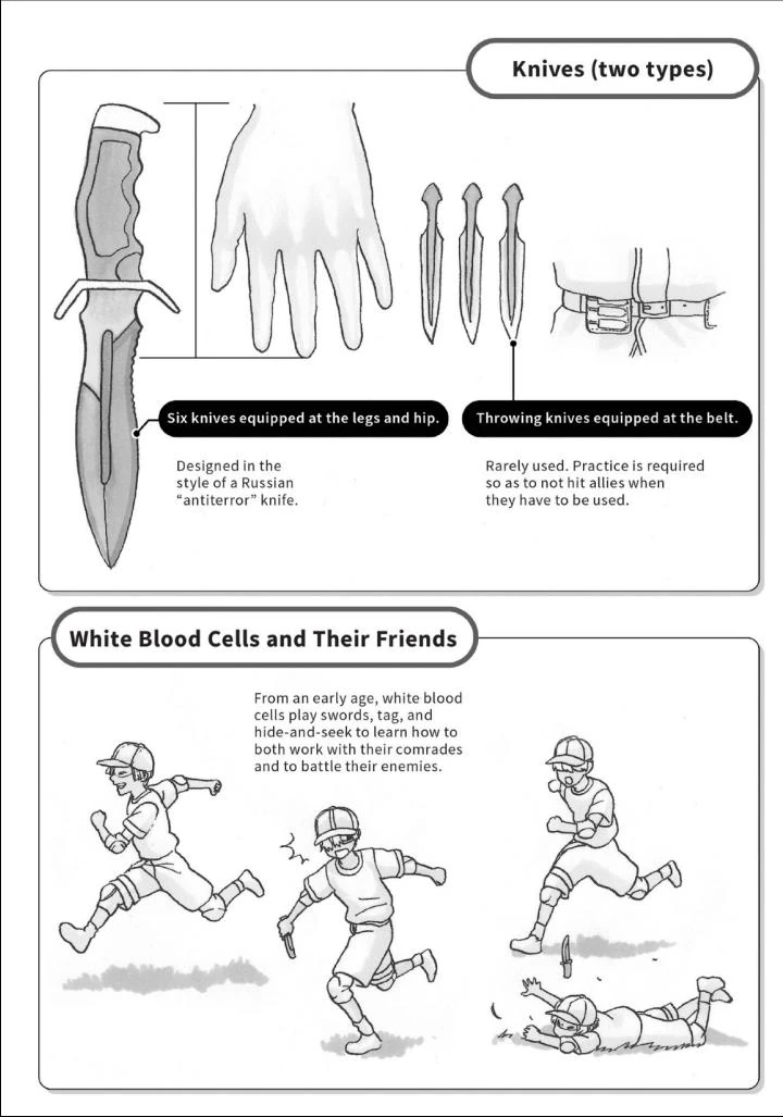 Each Neutrophil is armed with six knives at the legs and hip, as well as throwing knives and a transceiver to communicate with comrades. They also carry a hydrolyzing enzyme spray to break down bacterial corpses and other such things. Regardless of the situation, they are not allowed to remove any piece of uniform during work or they would not be able to respond to an emergency.