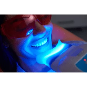 Zoom! Teeth Whitening: Blue LED light-accelerated technology and whitening gel are used to achieve rapid whitening results. A thin layer of hydrogen peroxide is dissolved over the top of your tooth enamel, then the LED light is applied, thereby releasing oxygen that flushes out tooth discoloration.