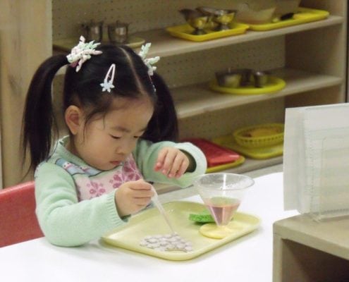 Around the age of three, the children are moving into the Second Plane of Development, that of the “Absorbent Mind.” This is a critical “scaffolding” year that meets the needs of children from the age of 30 months until they are ready to move into the Preprimary Classroom (three years of age as of September of the year they begin). In the Transitional Preschool room, we accept a maximum of 24 children with three Montessori teachers. Near the age of 30 months, children are primed for additional challenges in all areas. They are developing more independence. They have become more physically capable with their gross and fine motor skills and are ready for increased challenges to continue to develop those skills. They are also becoming more interested in learning about their world. For this, the Montessori materials provide a wonderful vehicle to help the children begin to sort and organize all they have been learning during their stage of the “Unconscious Absorbent Mind” – as Maria Montessori characterized the minds of children prior to the age of three. This Transitional Preschool room provides an increasing level of structure, more of the Montessori materials, and a broader curriculum to expand and enrich the learning opportunities for these very young preschool children. Initial exposure is made in all content areas, with the anticipation that the children will be introduced to yet another level when they move into the Preprimary Classroom the following year. Foundation goals we have for the children include helping them develop a work cycle, to work within the organization of the classroom and interact positively with others. In addition, we are working toward helping the children develop their attention spans to enable them to sit in small groups for a teacher’s presentation and to be able to select and complete (age-appropriate) work with focus.