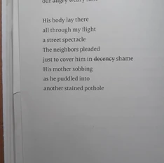 The first page of nearly every poem in Newsworthy displays mileage in the top right-hand corner. Although it is not explicitly stated what these distances represent, it can be inferred that she is documenting the distance between herself and the event described in the poems at the time in which they occurred. Victims of police brutality like Freddie Gray and Oscar Grant are referenced in the poems On Baltimore from Beeville and Freak Show Station respectively, as well as lesser-known individuals mentioned in other poems whose experiences are presented as equally legitimate. One such individual is Amandla, whose encounters with police and judicial oppression are spaced throughout the collection, starting with her as a child witnessing her brother and parents harmed and haunted by the police, and ending with her as an adult who had faced some jarring encounters of her own.