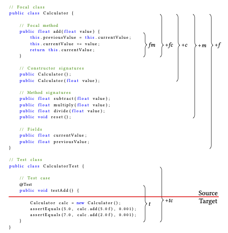 • fm+fc+c+m: this representation adds the signatures of the other public methods in the focal class. The rationale that motivated this inclusion is that the test case may need to invoke other auxiliary methods within the class (e.g., getters, setters) to set up or tear down the testing environment.