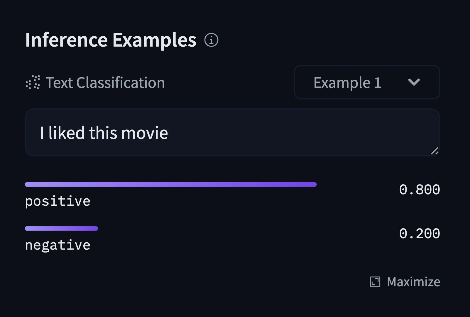 Moreover, you can specify non-text example inputs in the model card metadata. Refer here for a complete list of sample input formats for all widget types. For vision & audio widget types, provide example inputs with src rather than text.