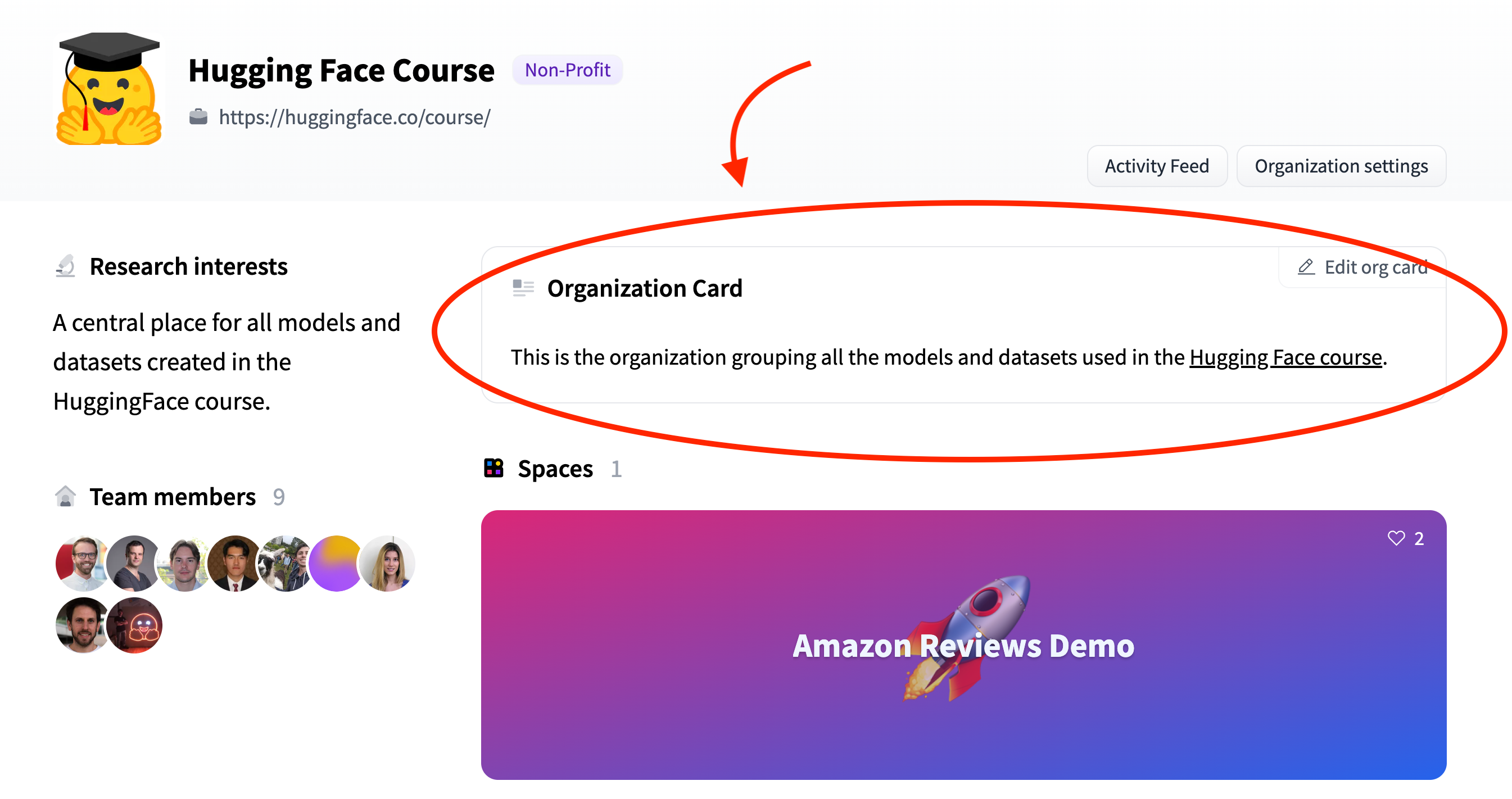 You can create an organization card to help users learn more about what your organization is working on and how users can use your libraries, models, datasets, and Spaces.