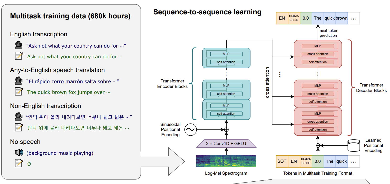A decoder takes the encoded audio representation and autoregressively predicts the corresponding text tokens. It’s a standard Transformer decoder trained to predict the next text token given the previous tokens and the encoder output. Special tokens are used at the beginning of the decoder input to steer the model towards specific tasks like transcription, translation, or language identification.